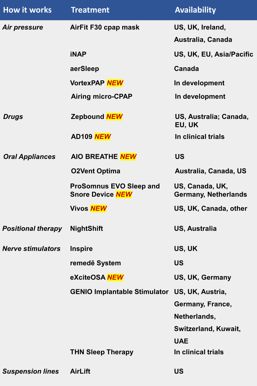 Recommended for obstructive sleep apnea: AIO BREATHE , AirFit F30 cpap mask, Airing micro-CPAP, AD109 NEW, aerSleep, AirLift, eXciteOSA NEW, GENIO, iNAP, Inspire, NightShift, O2Vent Optima, ProSomnus EVO NEW, THN Sleep Therapy, Vivos NEW, VortexPAP NEW, Zepbound NEW